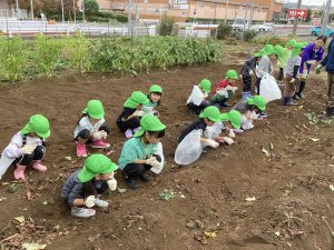 畑に着くと、軍手を付けて早速さつまいも掘り!一人一株を掘ります。「まだ出てこないよ。」「たいへんだー。」などと言いながら掘り進めていくと少しずつさつまいもの姿が見えてきて、さつまいもを掘り上げることが出来ると「やったー!」「たくさんある‼」「大きい‼」と驚き、大きな声で嬉しそうにさつまいもを持ち上げ、保育者に見せてくれました。