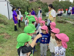 10/15㈬に5歳児りんご組がさつまいも堀りに行きました。長靴を履いて、芋を入れる袋を持って畑まで出発‼ 「たくさん掘れるといいね!」と期待を持ちながら歩きます。
