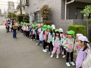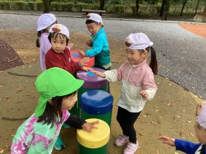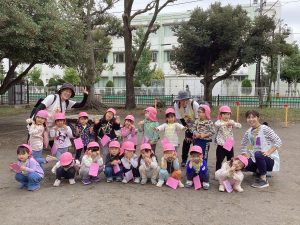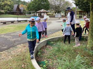 3歳児くるみ組は歩いて、多摩平第一公園へいってきました。行く前に先生からスタンプラリーのカードをもらい、元気に出発しました!行く途中の陸橋で電車に手を振ったり、「いい匂いがするー!」と金木犀の香りに気付いたり、「大きな柿があるよー!」などいろいろな発見をしながら歩いていきました。