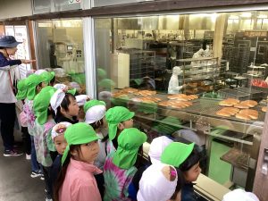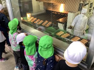 オギノパン工場では、お姉さんの話を聞いてからパンが作られている工程を見学させてもらいました。子どもたちはコッペパンがレーンの上を流れていく様子を見て「わあー!!きたきた!」「すごいねー!」と目を輝かせて見ていました。その後は、出来立ての揚げパンをたべました。「おいしー!」「もっとたべたーい!」と大喜びの子どもたちでした!美味しい揚げパンを食べた後は宮ケ瀬ダムへ向けて出発です!