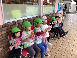 スタンプラリーの後は、みんなでおやつタイムです!木のベンチに座って、おせんべいやラムネを美味しそうに食べていました🍬