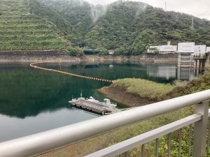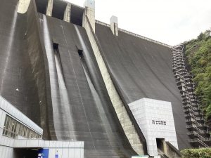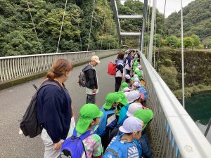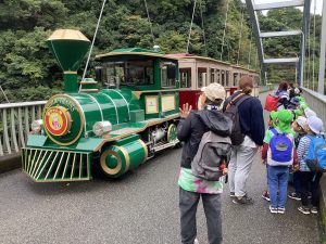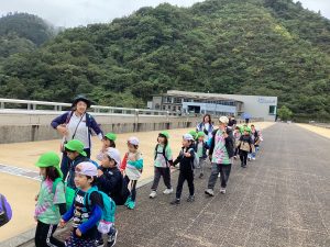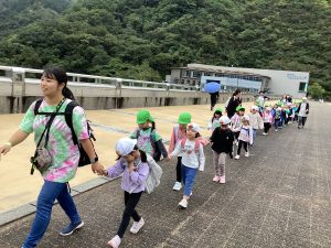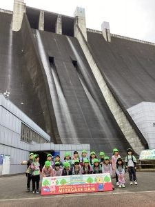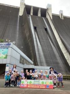 ダムの入り口では、野生のお猿さんがお出迎えしてくれました。エレベーターでダムの下まで行くと、後ろに大きなダムの壁を見て、「おおきいねー!」「すごーい‼」とびっくりしている子どもたちでした。