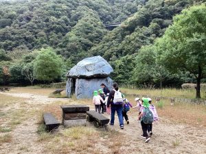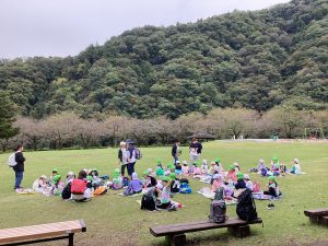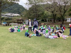 ダムを見た後は、相川公園に向けて出発。公園までは、滝を見たり石古屋をみたりしながら歩いていきました。公園では、広場で待ちに待ったお弁当です。「わたしは〇〇がはいってるんだ~♪」「サンドイッチもってきたー!」などみんな嬉しそうにお弁当をほおばっていました。