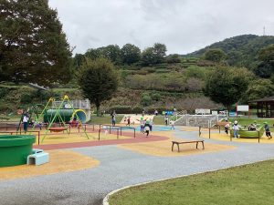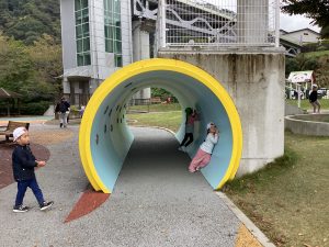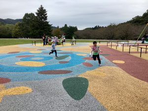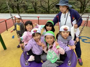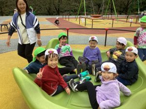 お弁当を食べて元気になった子どもたちは、幅の広い滑り台、ブランコ、トンネル、グルグル回る遊具で遊び、どれも楽しくてみんないい笑顔でした。