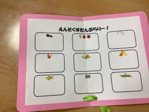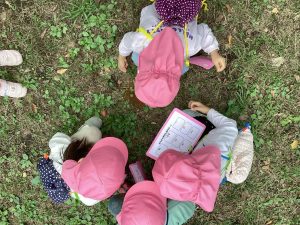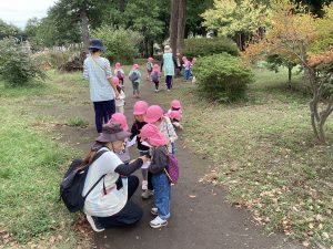 公園に着くと、みんなでスタンプラリーの絵にある、赤い葉っぱ、どんぐり、お花、アリ、などを探しました。「バッタはこっちにいたよー!」とまだ見つけられていないお友だちに教えてあげながら、みんなで協力してスタンプをためていく子どもたちでした。