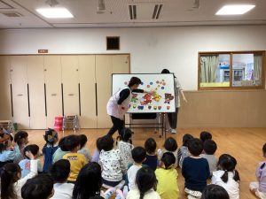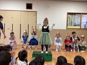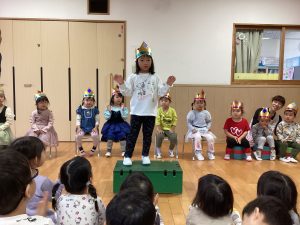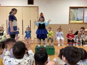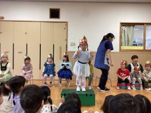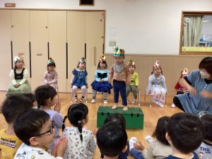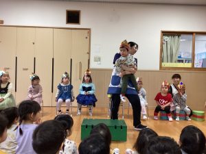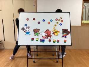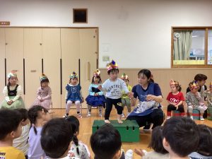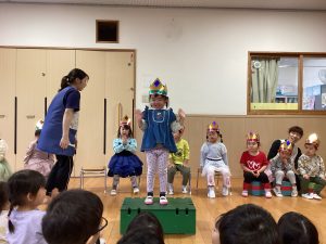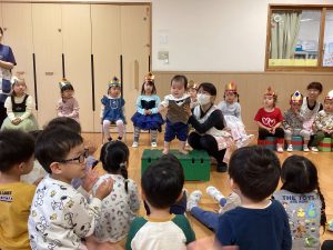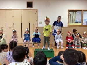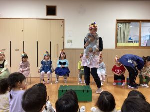 職員からの出し物は、『山の音楽家♪』のパネルシアターでした。歌に合わせてどんどん動物たちが出てきます。一緒に歌いながら次は何かな?とワクワクしながら楽しんでいました♪最後は、うさぎが花束を持ってきてお祝いをしてくれました💐