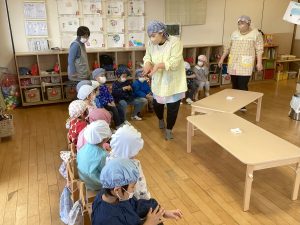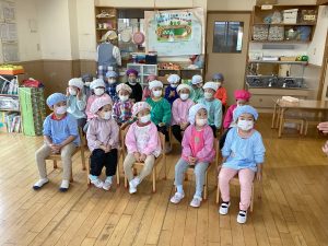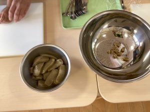 4歳児はさつまいもと大根を切りました。4歳児は包丁を使った調理保育は2回目です。先生に「猫の手でね~」と教えてもらいますが、、、親指を中に入れると他の指が出てきてしまったり💦指を丸めると親指が出てしまったり💦真剣な表情で切っていました。終わってから感想を聞いてみると、「手を切りそうで緊張した~!」「お家でやってるから簡単だった~!」などそれぞれが楽しんで調理活動が出来ました。