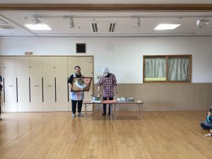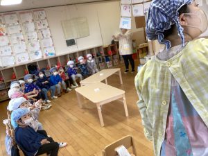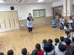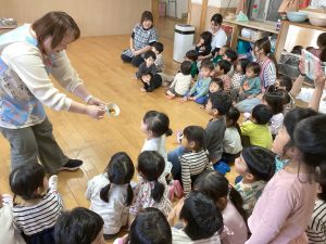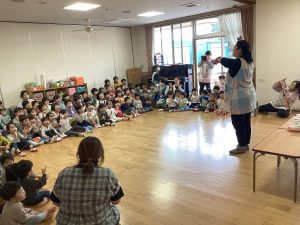 調理活動の後は、0歳児~5歳児までホールに集まって集会です。最初に「一本さつまいも」の手遊びをしてから、「焼き芋グーチーパー」で盛り上がりました。