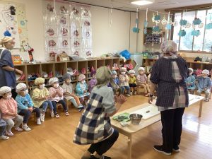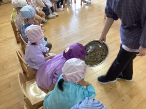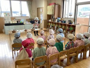11月6日(木)に芋煮会を行いました。幼児クラスはスモックを着て調理保育の準備をし、真剣に先生のお話を聞いていました。