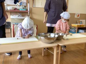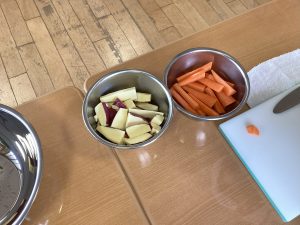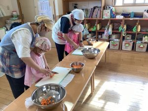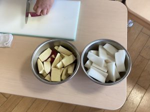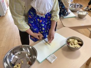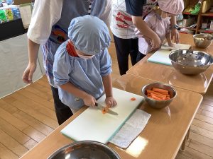 5歳児はさつまいもと人参を包丁で切りました。さすがの年長さんは先生の補助なしで切れる子が多く、出来るだけ人参を薄く切ろうとしている子や、さつまいもは固いので苦戦している子もいましたが、大きさも考えながら上手に切ってくれました。