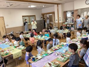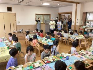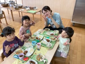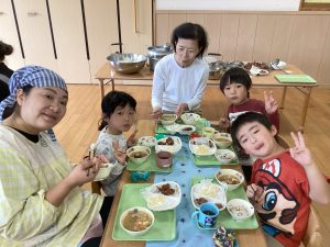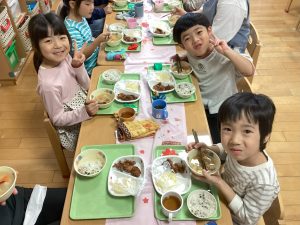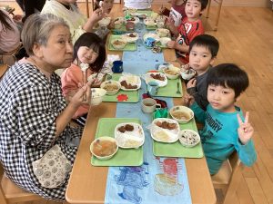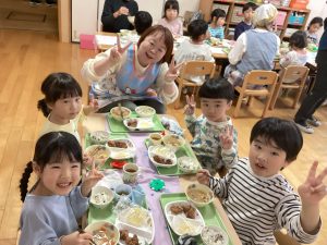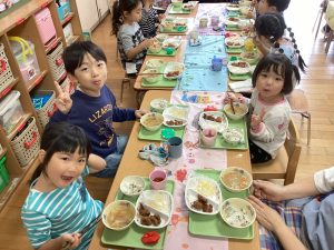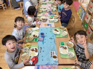 給食は、4,5歳児はホールで会食をしました。芋煮汁をみて、「これ私が切ったお芋だよ!」「おいしいね~!」と楽しい会食になりました🍲
