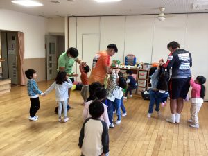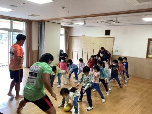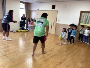 0歳~3歳児はホールで交流をしました。ラグビー選手が前に並び、自己紹介をしてくれました。子どもたちは大きな選手を目の前に「わあ~大きいね~!」とびっくりしていました。子ども用のラグビーボールをたくさん持ってきてくれて、ボールを投げたり転がしたりして楽しみました。タックルも教えてもらい、実際にボールを持ちながら選手が持つヒットバッグに向かって走っていき、タックルをしたり、選手に抱っこしてもらったり高い高いをしてもらったりしました。大きくて「ちょっとこわい」と遠目で見ている子もいましたが、貴重な体験が出来ました。