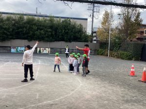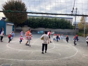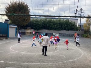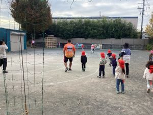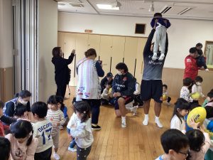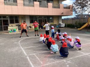 園庭では、2チームに分かれて選手としっぽ取りゲームをして遊びました。最初は相手チームの選手についているしっぽを子どもたちが取ります。2回戦目は子どもたちがしっぽを付けて選手に取られないように逃げました。「やった!とれたー!」と喜んでいた子どもたちでした。