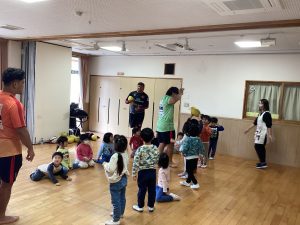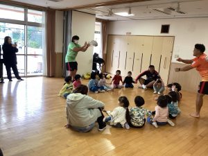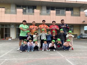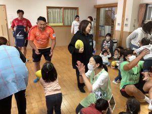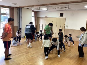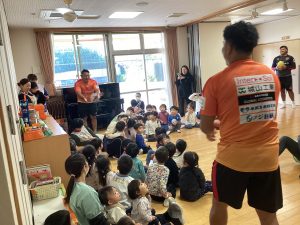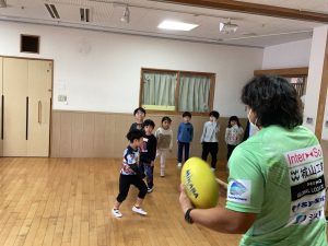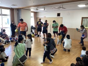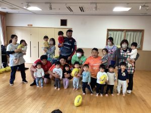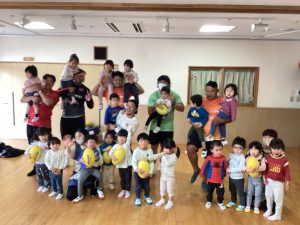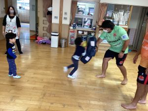 0歳~3歳児はホールで交流をしました。ラグビー選手が前に並び、自己紹介をしてくれました。子どもたちは大きな選手を目の前に「わあ~大きいね~!」とびっくりしていました。子ども用のラグビーボールをたくさん持ってきてくれて、ボールを投げたり転がしたりして楽しみました。タックルも教えてもらい、実際にボールを持ちながら選手が持つヒットバッグに向かって走っていき、タックルをしたり、選手に抱っこしてもらったり高い高いをしてもらったりしました。大きくて「ちょっとこわい」と遠目で見ている子もいましたが、貴重な体験が出来ました。