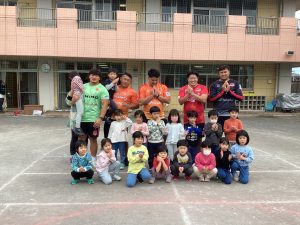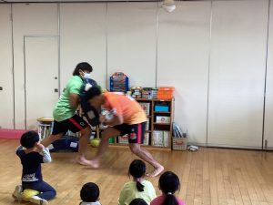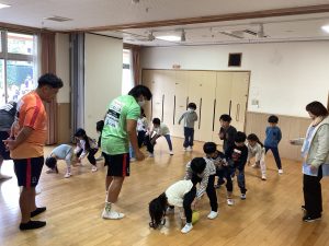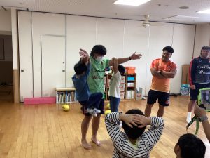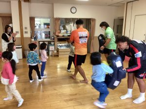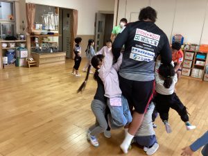 最後は人間遊園地です。選手の両腕にぶら下がってぐるぐる回ってもらいとびっきりの笑顔で楽しんでいた子どもたちです。