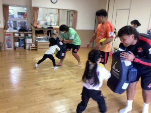 次は選手が持っているヒットバックに向かってタックルをしたり、選手とキャッチボールをしました。はじめは遠慮気味だった子どもたちも何回か繰り返すうちに力強いタックルになっていきました。