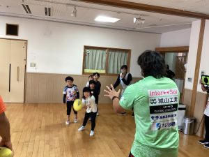 ホールでは、2チームに分かれてボール送りゲームでどちらが速く送れるかを競いました。