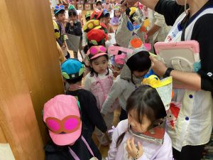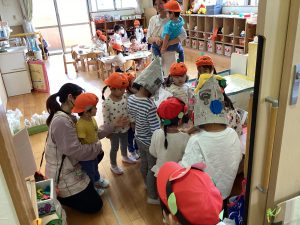 3.4歳児はペアになり、各クラスに「トリックオアトリート!」と言って回りました。各クラスからもらったカボチャやお化け(折り紙)キャンディーを手作りバックに入れて嬉しそうにしていました。