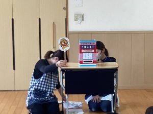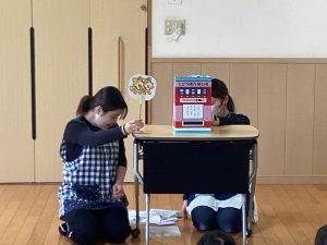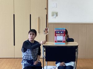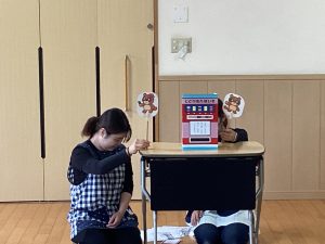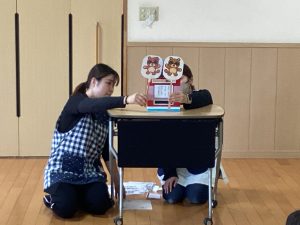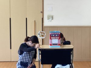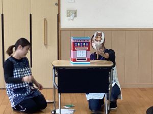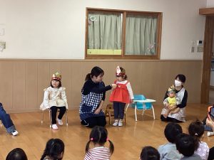 今月の職員からの出し物は、『ぽんたのじどうはんばいき』のペープサートでした。ポンタが色々な動物が入れた葉っぱをかんむり👑や首飾りに変えると、子どもたちは「おー!」「すごーい!」と嬉しそうでした。最後のポン子ちゃんの欲しいものは「おともだち」でした。ポンタとポン子ちゃんがお友だちになると、「良かったね☺」とみんなほっこり暖かい気持ちになった誕生会でした。