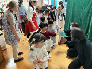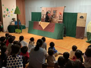 今年も『うどの大木』の皆さんが来園し、人形劇を見せてくれました。演目は「おおかみと七ひきの子やぎ」でした。子どもたちは真剣な表情で、おおかみと子ヤギたちのやり取りを見ていましたが、子ヤギたちが次々に飲み込まれてしまう所では心配そうな表情の子どもたちでした。