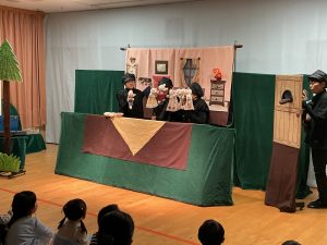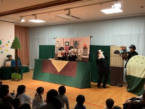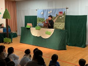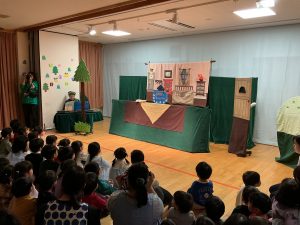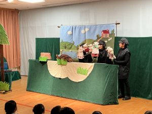 今年も『うどの大木』の皆さんが来園し、人形劇を見せてくれました。演目は「おおかみと七ひきの子やぎ」でした。子どもたちは真剣な表情で、おおかみと子ヤギたちのやり取りを見ていましたが、子ヤギたちが次々に飲み込まれてしまう所では心配そうな表情の子どもたちでした。
