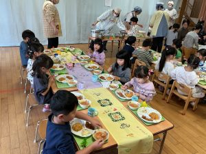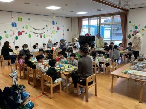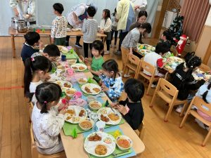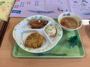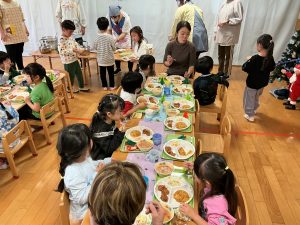 そして、給食は4.5歳児で交流して会食をしました。トレイの上に折り紙のツリー🎄が一人ひとり飾ってあり、「ツリーがあるー!かわいい❣️」と嬉しそうな子どもたちでした。美味しい給食をお友だちや保育者と一緒に会話を楽しみながら食べました🍽️