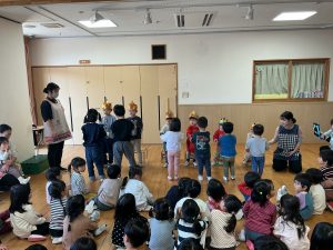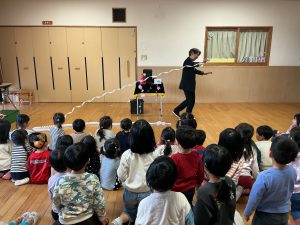 次は不思議なボールのマジックです。保育者も参加し、赤いボールが池本さんの手から保育者の手に移動したり増えたり大きくなったりするのを見て、大喜びの子どもたちでした。