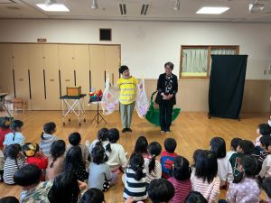 そして、今月はマジカルクローバーの山下さんと池本さんが来てくれました🎩 まず最初はハンカチマジックです。次々にカラフルなハンカチが出て来て、1月ということもあり最後にはおめでたい鶴が出てきました。