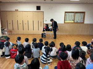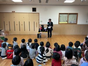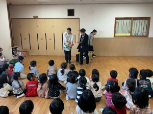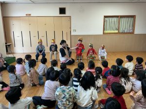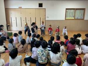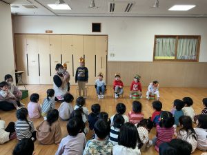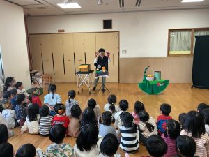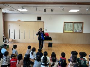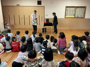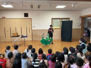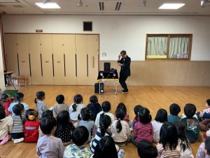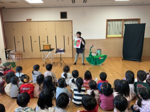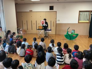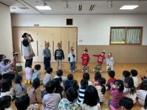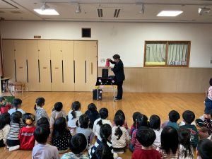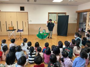 次は不思議なボールのマジックです。保育者も参加し、赤いボールが池本さんの手から保育者の手に移動したり増えたり大きくなったりするのを見て、大喜びの子どもたちでした。