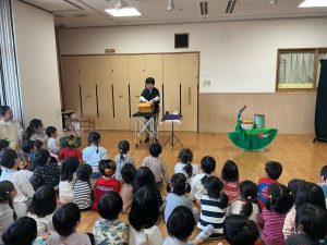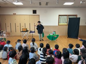 次の手品は、『はらぺこあおむし』のお話しに合わせて次々に食べ物が、空の筒や箱から出てきました。最後には山下さんがちょうちょになって登場!「すごーい!」と大きな歓声が起こりました!