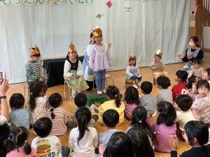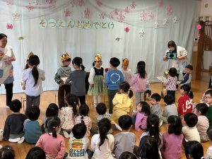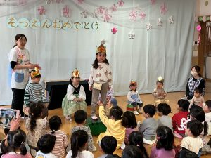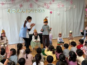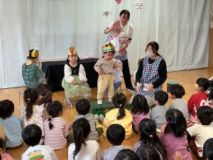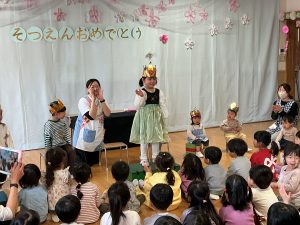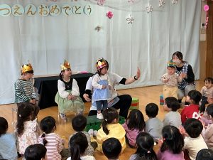 先生からのプレゼントは、「へんしんとんねる~」トンネルの中にかえるが「ゲコゲコゲコ」と鳴きながら入って行くと、「こげこげこげ」と焦げたかえるが出てきたり、「牛」がトンネルに入ると、「牛乳とバター」、「麦」がトンネルに入ると「小麦粉」になって出て来て、「牛乳・バター・小麦粉」をトンネルに入れると、「ケーキ」になって出てきたのです。でも、スポンジだけのケーキで少し寂しくて先生たちのポケットに何か入ってないかなー?って会場にいた保育士のポケットを探してみると、5歳児の担任のポケットからいちご🍓が出て来てみんなびっくり‼そのいちご🍓を5歳児クラスの誕生児2人がスポンジだったケーキに飾ってくれました。素敵なデコレーションケーキが出来上り、みんなでパクパク食べました。おいしかったね。